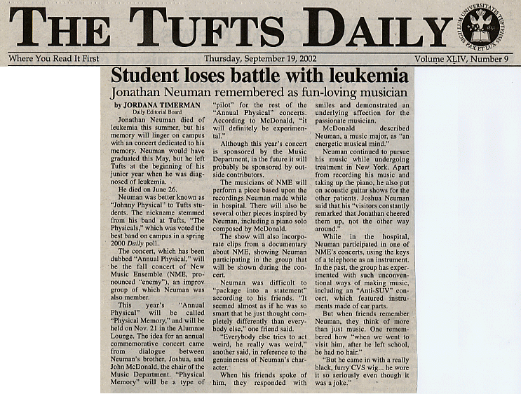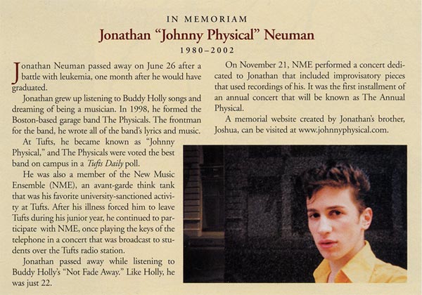 Jonathan’s life forever changed when he was diagnosed with leukemia in October of 2000 and started treatment at Memorial Sloan-Kettering Hospital in New York City. In the midst of chemotherapy, he staged an acoustic event, “Johnny Physical: Plugged” for friends, family, and fellow patients. During intermittent stays in the hospital, Jonathan continued to compose and record music—frequently from his hospital bed. He developed a legion of admirers, including Ari Up! of the iconic punk band The Slits, Miss USA Kandace Krueger, and famed documentarian Albert Maysles (who interviewed Jonathan for a series he was working on for PBS).